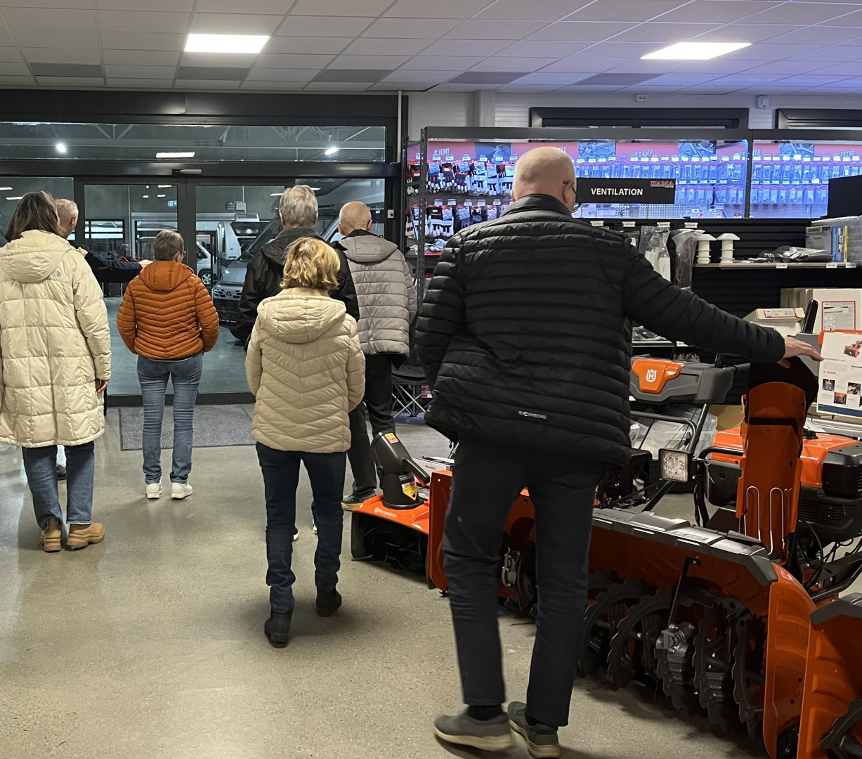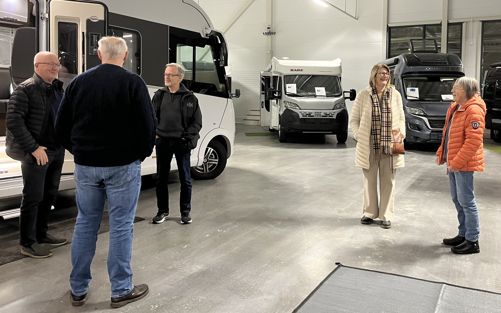 Vi fikk omvisning og god og inspirerende informasjon om bedriften. Det var et flott og gedigent nybygg med verksted, vaskehall i tillegg til store haller med lager og utstilling av traktorer, redskaper, bobiler, campingvogner og båter samt en butikk med caravan- og annet utstyr.
